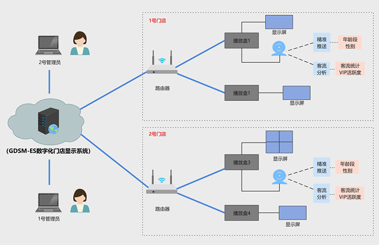该客户为宁波地区零售门店,在一段时间内,客户发现门店销售额持续下滑,但是不知道原因出在哪里,到底是消费者减少,还是广告推送出现问题,亦或是其他原因,客户没有头绪, 三亿(集团)体育科技数据化门店显示系统完美的解决了客户痛点,方案拓扑图如下: