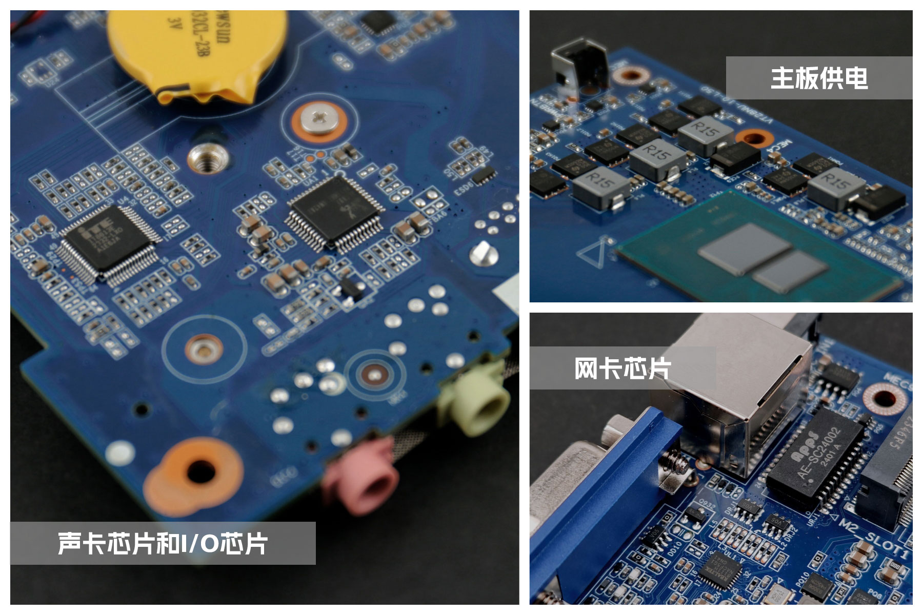 三亿(集团)体育桌面云终端Y-BOX S2主板采用的是3+1相供电,在主板两侧的接口附近,都分布了相关的芯片。在千兆网口附近有1个网卡芯片RTL 8111H,在主板背面的音频接口附近可以看到一个经典的“小螃蟹”ALC897 声卡芯片,声卡芯片附近有一个I/0 芯片HE8613E-LX。