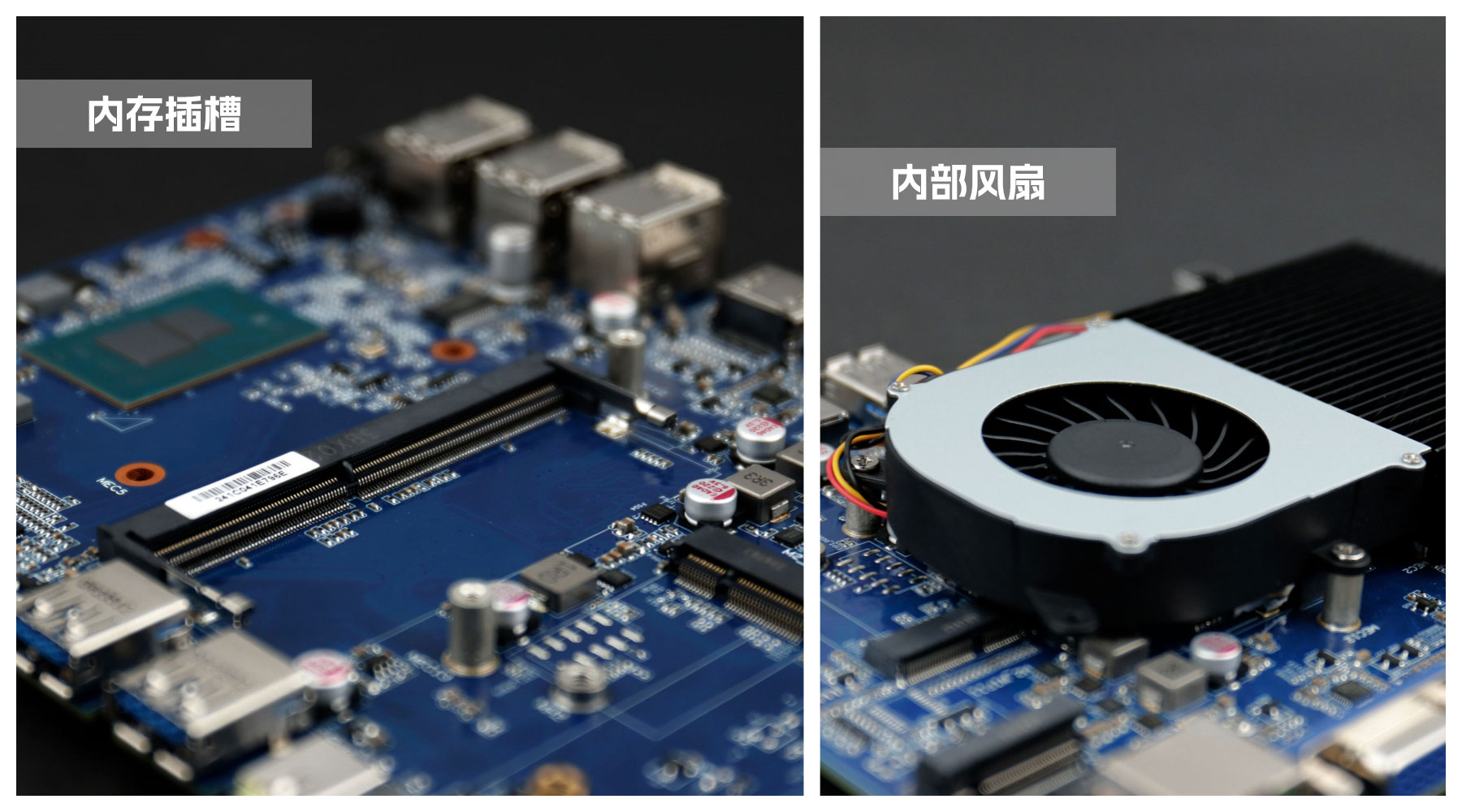 三亿(集团)体育桌面云终端Y-BOX S2主板中部是内存插槽,采用单通道笔记本内存槽设计,最大支持容量可达32GB,最高支持DDR4-3200MHz频率,横插的形式可以减少主板的占用体积,使整体机身更紧凑,内存顶部的风扇起到高效散热的作用。