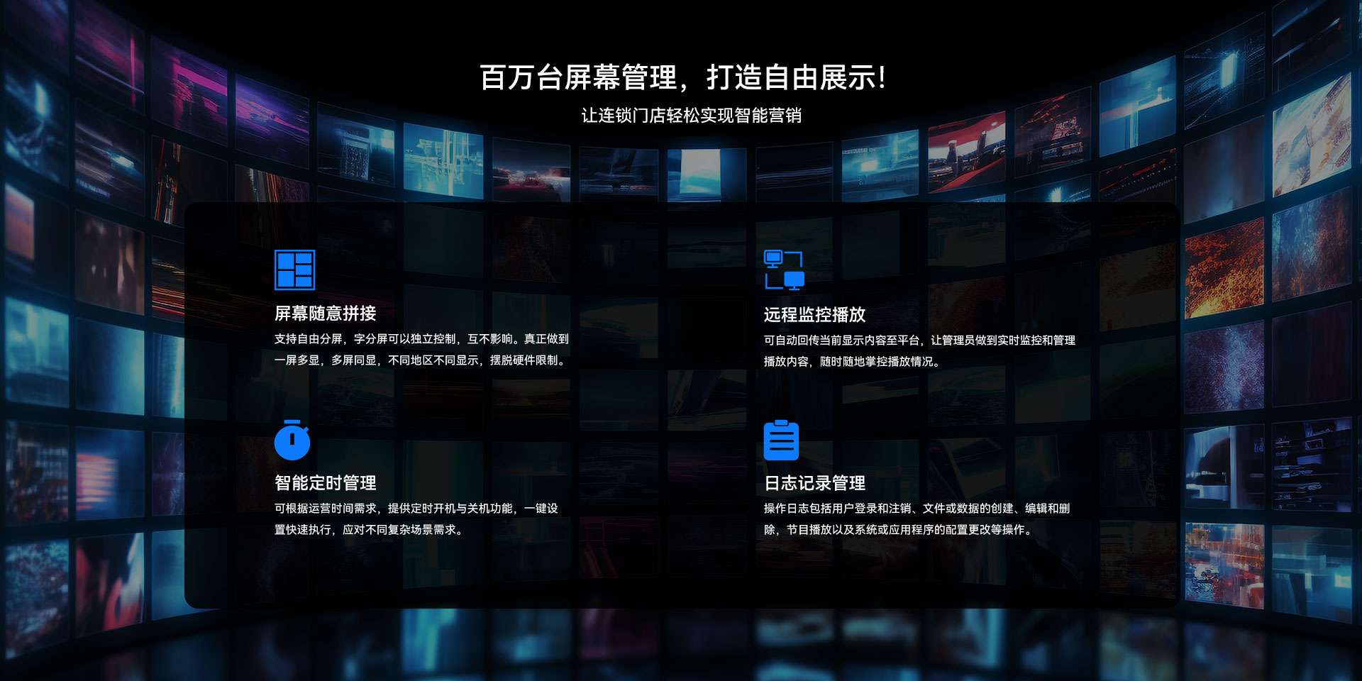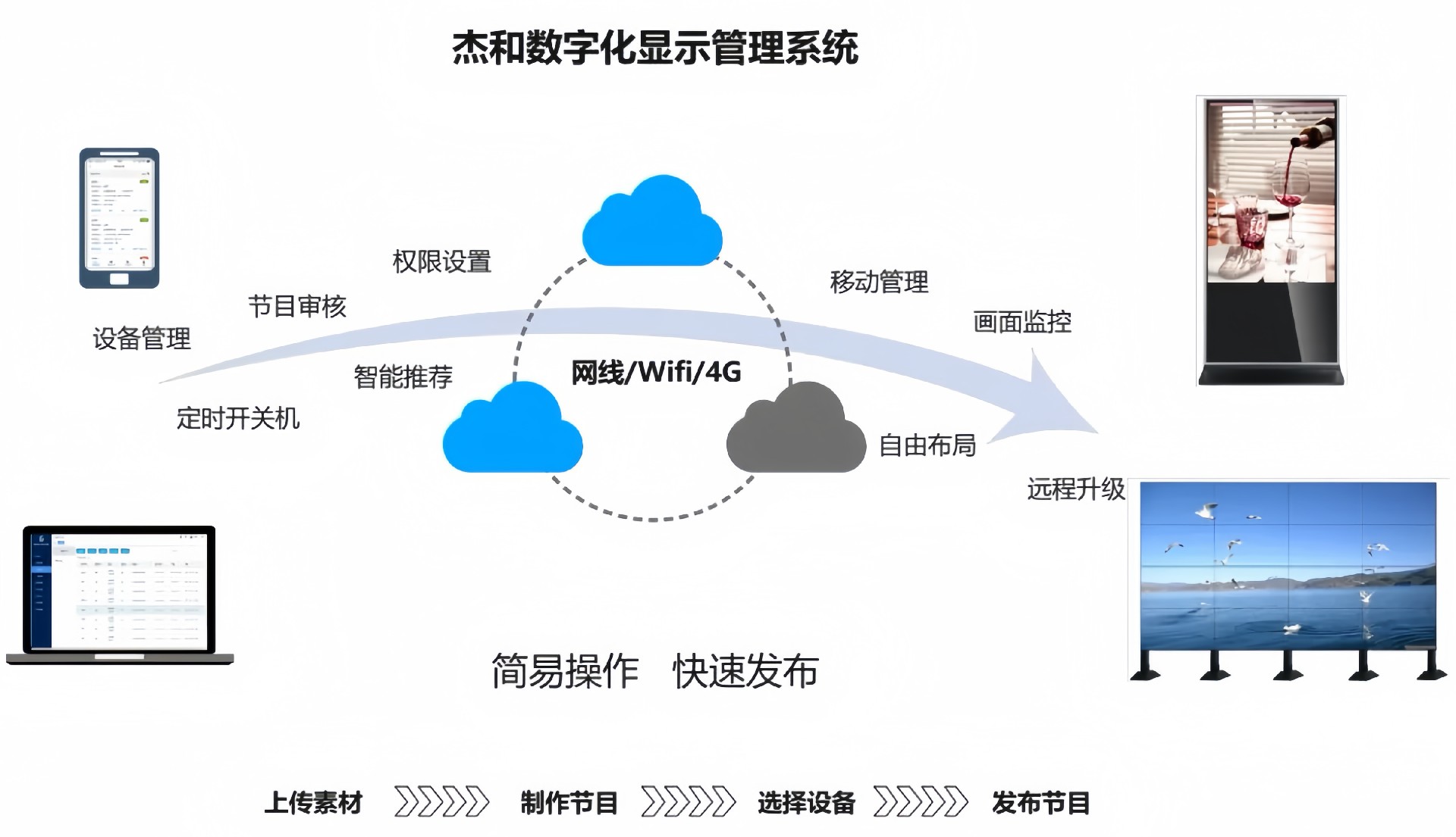 目前 三亿(集团)体育科技GDSM-ES系统覆盖市场上多形态网络智能显示终端,满足行业全产品业态需求,如广告机、LED显示屏、LCD拼接屏 、普通液晶电视等各种显示终端,广泛用于广告宣传、通知公告、指示引导。