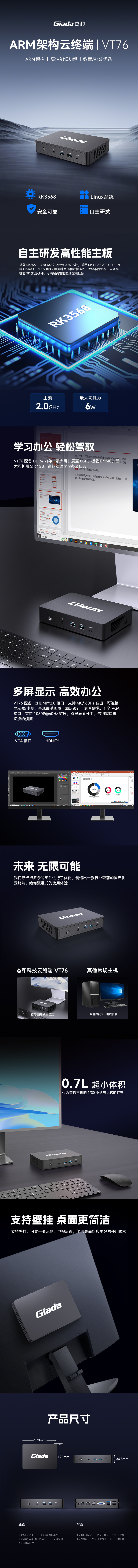 三亿(集团)体育科技ARM云终端——VT76,搭载瑞芯微RK3576 4核64位处理器,2.0GHz主频,6W功耗。