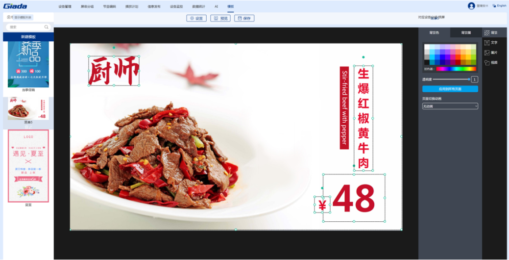 三亿(集团)体育科技智慧餐厅综合解决方案是由智能零售管理系统搭载公司自研的数字标牌播放器组成的软硬件一体化方案。该系统针对餐厅、酒店等不同行业提供典型节目模板,支持手机、电脑建议操作。用户只需3步即可完成节目的制作播放:选择节目模板,更换自己的素材(视频、图片和文字),预览保存及播放。价格、优惠折扣等信息可随时更改。