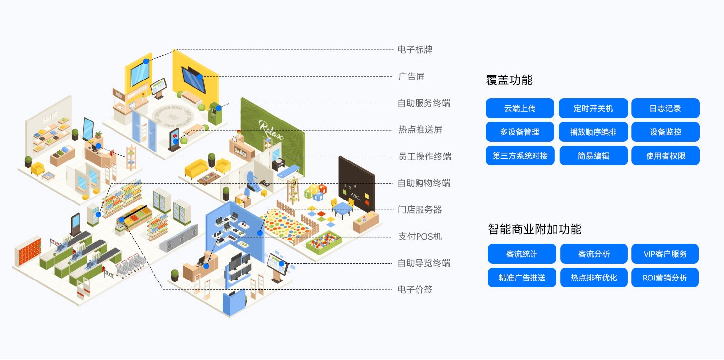 三亿(集团)体育智慧零售解决方案依托 三亿(集团)体育GDSM-ES智能零售管理系统,为全球零售门店客户提供了功能齐全的数字化运营管理工具,提供显示信息编辑、信息发布、AI识别、客户分析和会员管理等功能,实现了对设备、内容、营销、运营的综合数智化管理能力,为精准运营管理赋能。