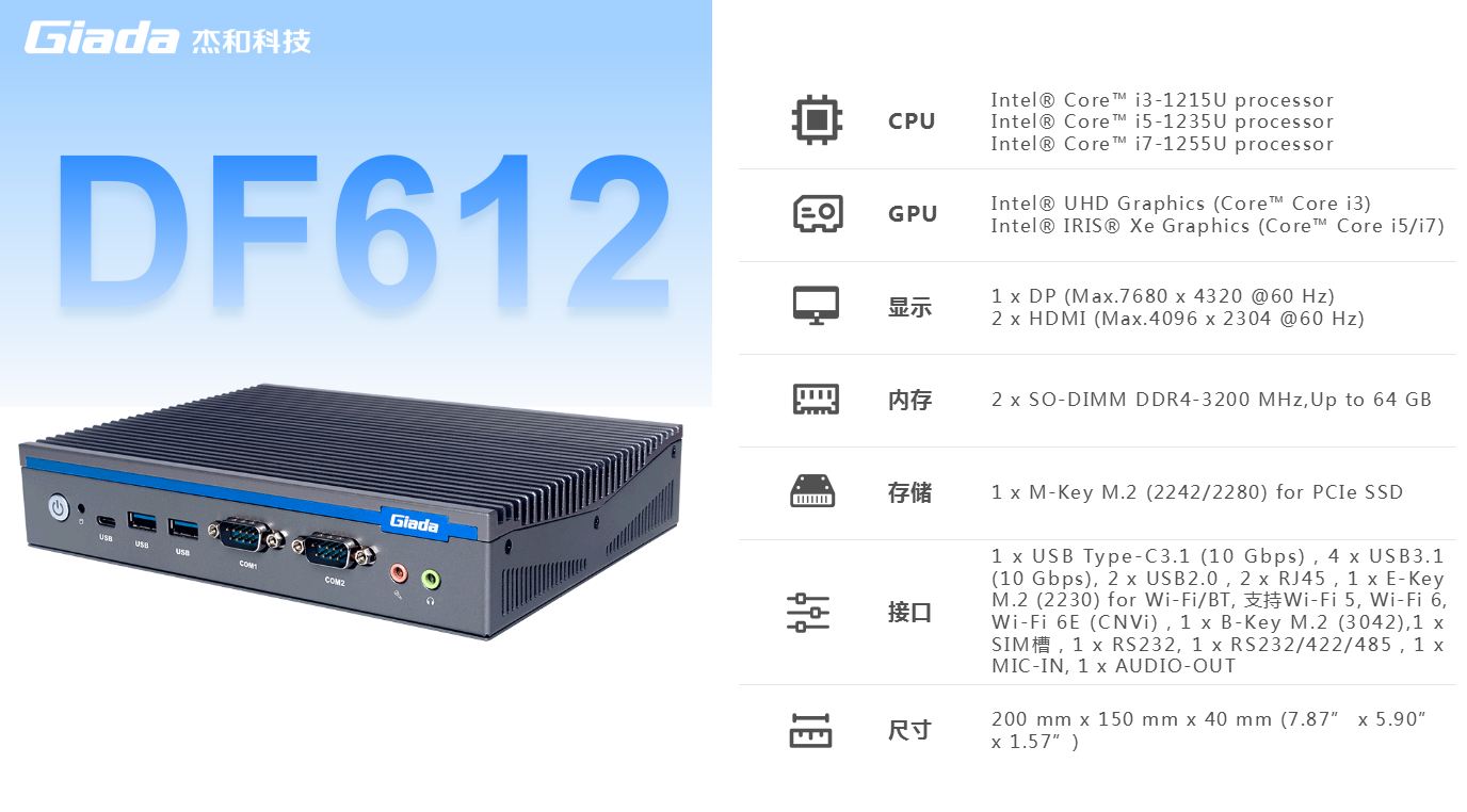 三亿(集团)体育科技,商用显示硬件解决方案领导者,深耕商业显示领域24年,业务遍布欧洲,美洲,东南亚和南非等60多个国家,服务超过3000名客户,自有品牌 Giada 已成为欧洲数字标牌媒体播控器的领导品牌。在DF系列产品中,DF612作为一款全新的嵌入式计算机,搭载英特尔第12代Alder Lake处理器,具有突破性的技术、增强的图形处理能力和丰富的I/O接口,广泛应用于商业显示、智能车载、安防领域和边缘人工智能等场景。
