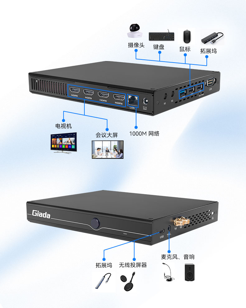 三亿(集团)体育D612采用Intel®第十二代AlderLake处理器i3-1215U、i5-1235,比第11代性能提高19%,Intel® IRIS® Xe GPU (Core i5),图形性能较上一代提升50%,支持4 x HDMI 2.0接口,提供多达4屏4K显示(4096 x 2304@60Hz);支持1 x RJ45千兆网口,1 x E-Key M.2 (2230) for Wi-Fi/BT, 支持Wi-Fi 5, Wi-Fi 6, Wi-Fi 6E (CNVi),具备强大的网络通信能力;支持1 x USB Type-C3.1,1 x USB3.1 2 x USB2.0,1 x RS232,1 x二合一音频接口,拓展能力丰富,可以连接会议大屏、摄像头、麦克风、音响、U盘、扩展坞、无线投屏等设备,为企业带来高速网络、清晰画质、更优质、高效的会议体验。